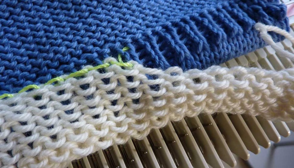- For unstable yarns, fold the waste yarn out of the way and hang the visible main yarn loops on the machine; hand knitters tin can use a minor bore knitting needle to option up the stitches.